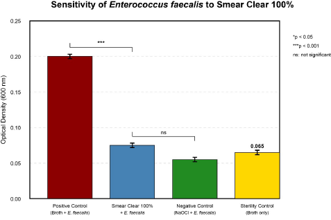 Figure 1. Antibacterial activity of Smear Clear® against Enterococcus faecalis (ATCC 29212®). Optical density measurements at 600 nm after 24h incubation. Values represent mean±SD (n=3). Statistical analysis: one-way ANOVA with Tukey's post-hoc test. ***p<0.001 vs positive control; ns: not significant vs negative control.
