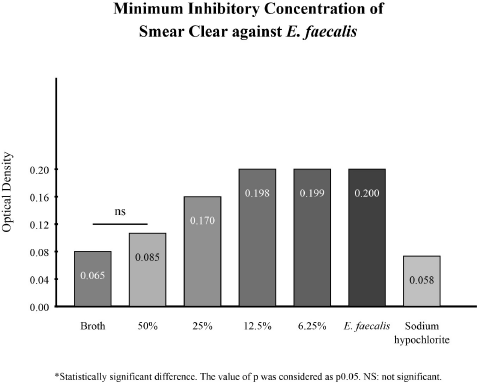 Evaluation of the minimum inhibitory concentration. In the findings of the minimum inhibitory concentration, it was observed that Smear Clear® at 50% had no significant difference compared to the broth; and that at concentrations of 25%, 12.5%, and 6.25%, there was a difference (p<0.05). With this information, it can be inferred that the minimum concentration needed of Smear Clear® to produce growth inhibition of E. faecalis (ATCC 29212®) is 50%. Figure 2 illustrates the minimum inhibitory concentration results at different Smear Clear® dilutions.