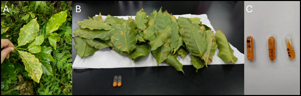 Figure 1. Collection of coffee leaves with rust in the field (A), scraping of inoculum (B), and storage in capsules in the laboratory (C).