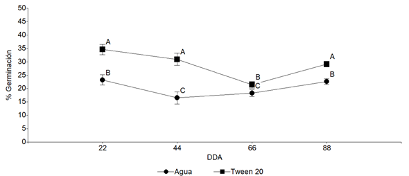 En ambos tratamientos (Figura 5) se identificó una disminución inicial en el porcentaje de germinación, seguida de un aumento, donde este último fue a los 66 DDA para Tween 20 y a los 44 DDA para agua desionizada.