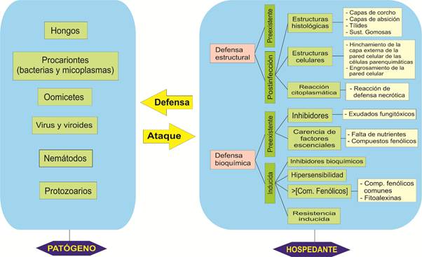 La Fitopatología evolucionó desde el pensamiento ideológico (Platón), pasó por el pensamiento sistémico (Bertalanffy) y llegó hasta el pensamiento complejo moriniano. En cada una de estas etapas evolutivas, desde lo simple hasta lo más complejo, la investigación científica fitopatológica se profundiza porque una enfermedad es un sistema abierto que se interrelaciona con todos los factores bióticos y abióticos. La epistemología fitopatológica en el pensamiento complejo demuestra que la investigación científica no solo es enfocada en el fitopatógeno o su hospedante, sino su enfoque es en toda la complejidad del proceso de infección, en el diagnóstico de la enfermedad y cómo esta se relaciona con las condiciones ambientales y acción del ser humano y, que, de no tomar las acciones de manejo, causa problemas socioeconómicos a nivel local, regional, nacional o global. Los patógenos utilizan armas estructurales y químicas para su ingreso al hospedante, utilizan vectores o aprovechan heridas, mientras que, el hospedante, utiliza mecanismos de defensa al ataque del patógeno (Figura 1). Asimismo, epistemológicamente, se demuestra que las condiciones ambientales son cruciales para que ocurra una enfermedad y, sobre todo, la responsabilidad del ser humano en el desarrollo de una epifitia o una convivencia con los patógenos de plantas. Respecto a esta aseveración, los patógenos de plantas causan enfermedad en condiciones óptimas para su desarrollo y las plantas pueden escapar a la enfermedad, siempre y cuando se las cultive en condiciones donde el patógeno no desarrolla. Por ejemplo, anteriormente, el control del patógeno era a base de un producto químico, con consecuencias positivas, por causar la muerte del patógeno, y negativas por generar resistencia en el patógeno, contaminar el ambiente y una posible toxicidad aguda o crónica al manipulador (ser humano). Por el contrario, en los últimos años se prioriza el enfoque One Health el cual considera que el sistema complejo ser humano-animales-medio ambiente es interdependiente y promueve la cooperación interdisciplinaria (Ambientech 2025). De tal modo, la epistemología fitopatológica permite incluir la interacción e interdependencia de los factores físicos y socioculturales conducentes a prevenir y mitigar las enfermedades de plantas de manera integral a través de capacitación integrada, colaboración con especialistas multidisciplinarios e implementación de políticas a nivel local, regional, nacional y global para garantizar la seguridad e inocuidad alimentaria, aliviar la pobreza, promover la equidad, enfrentar el impacto del cambio climático, proteger el medio ambiente, impulsar el desarrollo económico y fortalecer alianzas globales, incluyendo una alianza entre los defensores de One Health (Rizzo et al. 2021).