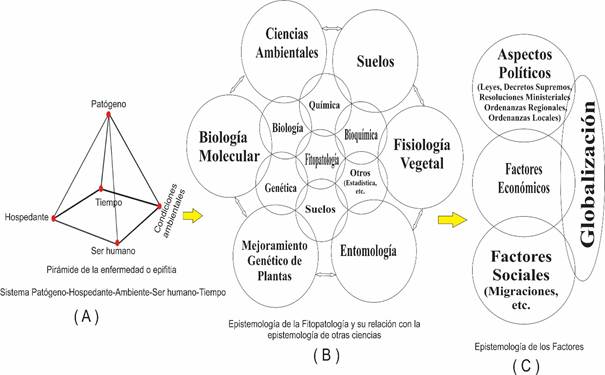 (A) Se produce la enfermedad o epifitia (Agrios 2024); (B) La presencia de las enfermedades de plantas da lugar a la investigación científica no solo en Fitopatología sino en otras ciencias; (C) La enfermedad no solo causa daños a nivel local sino a nivel regional, nacional o global, afectando los factores socio económicos y políticos y promovería la investigación científica en cada uno de los sistemas.