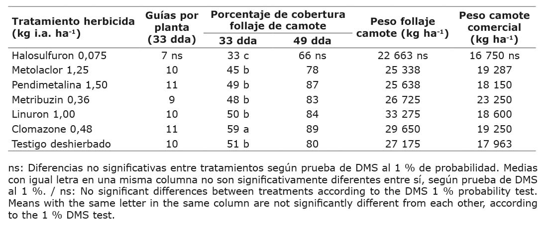 Para el número de guías por planta a los 33 dda, biomasa área del camote a la cosecha y variables de rendimiento, no se encontraron diferencias significativas entre los tratamientos. Los promedios de cada una de las variables indican que los herbicidas evaluados no afectaron de forma negativa la producción de raíces reservantes comerciales (Cuadro 2).