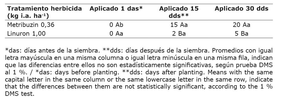 La siembra se realizó el 13 de agosto de 2021. Los tratamientos evaluados fueron: metribuzin 0,36 kg i.a. ha-1, pendimetalina 1,50 kg i.a. ha-1, clomazone 0,48 kg i.a. ha-1, halosulfuron 0,075 kg i.a. ha-1, linuron 1,00 kg i.a. ha-1, metolaclor 1,25 kg i.a. ha-1 y un testigo sin herbicidas y deshierbado a los 15 y 30 dds.