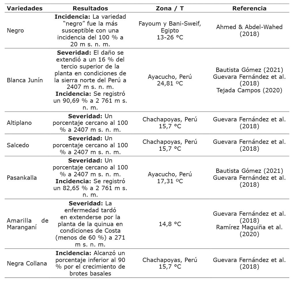 Las variedades peruanas presentaron mejor respuesta al mildiu velloso (más tolerantes que variedades extranjeras). En las investigaciones que se realizaron con un número reducido de variedades de quinua (Cuadro 1), se observa que la altitud y sus condiciones climáticas influyeron de forma significativa en la incidencia y severidad de la planta.