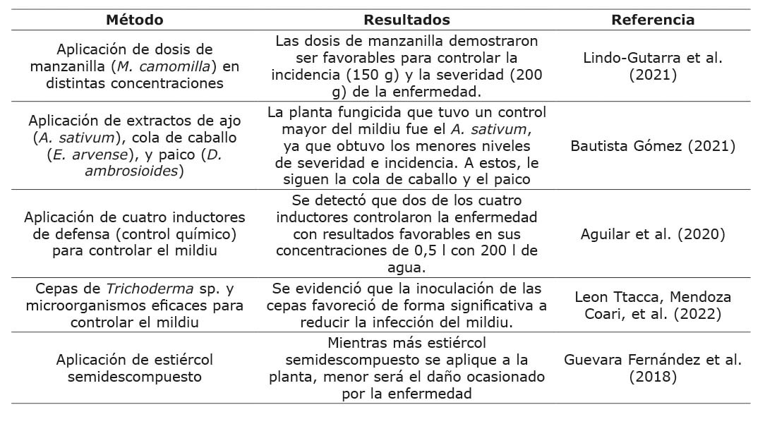 En cuanto a las formas que se emplearon para controlar la enfermedad, en la mayoría de los estudios se aplicaron métodos químicos con el propósito de evitar la muerte de la planta infectada por el mildiu (como la investigación de Aguilar, et al., 2020). No obstante, aquellas investigaciones que abordaron métodos novedosos para controlar el mildiu obtuvieron resultados favorables (Cuadro 2), pero sin lograr superar la eficacia de los tratamientos químicos.