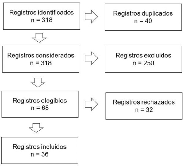 Se seleccionaron un total de 36 textos, de acuerdo con el proceso de selección definido, los cuales fueron registrados en un archivo, para luego ser organizados con base en información relevante como: año de publicación, país de desarrollo, idioma, método aplicado o resultados. Al inicio se distribuyeron los artículos seleccionados con base en el año que fueron publicados; esta distribución se observa en la Figura 2 y se realizó para identificar la realidad sobre las publicaciones en torno a esta problemática de interés mundial.