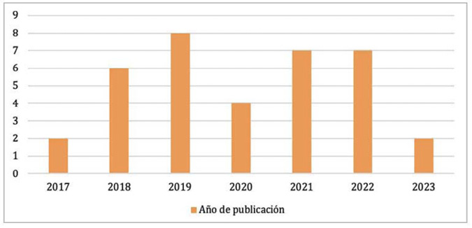 De acuerdo con los datos sistematizados, en el 2019 se presentó el mayor número de publicaciones (22 %). Le siguieron los años 2021 y 2022, con 19 % cada uno. En 2018 solo se registraron seis publicaciones (17 %), seguido del 2017 y 2023, cada uno con 6 %. Esto evidencia un crecimiento en el año 2018 y, a partir de este año, una constante en el número de publicaciones (con una ligera caída en el 2020).