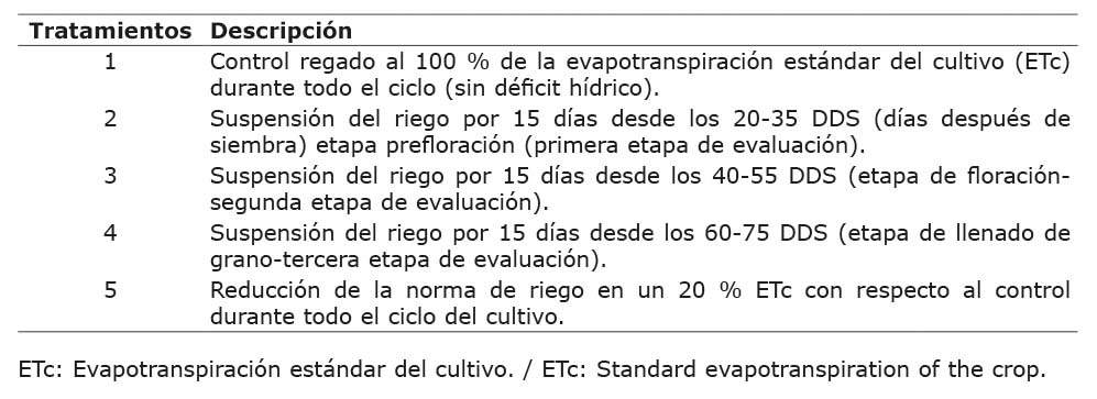 Table 1. Description of the treatments under study, evaluating the sensitivity of the maize (Zea mays) ADV-9293 yellow hybrid to controlled water deficit. Coronel Segundo de Villarreal Institute (ICSV) and Agricultural Innovation Institute of Panama (IDIAP) El Ejido, Los Santos, Panama. 2020-2021.