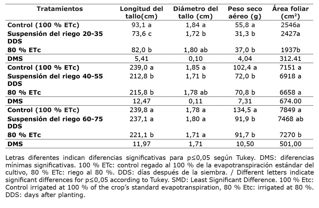 El control presentó diferencias significativas (p<0,05) en comparación con los tratamientos restantes en las etapas evaluadas para las variables de longitud y diámetro del tallo, peso seco y área foliar, con valores superiores. La longitud del tallo, en la etapa de 20-35 DDS fue mayor en el control con 93,1 cm, seguida por el tratamiento con 80% del riego con 82 cm, el tratamiento con suspensión del riego presentó los valores más bajos con 73,6 cm. En esta misma etapa el diámetro del tallo fue mayor en el testigo y el tratamiento con 80 % del riego. Los tratamientos con suspensión y reducción del riego no difirieron entre ellos con valores de 1,72 y 1,80 cm respectivamente. El peso seco aéreo fue mayor en el control con 55,8 g, los tratamientos restantes no difieren entre ellos y presentan valores de 31,3 y 37,0 g, respectivamente (Cuadro 2).
