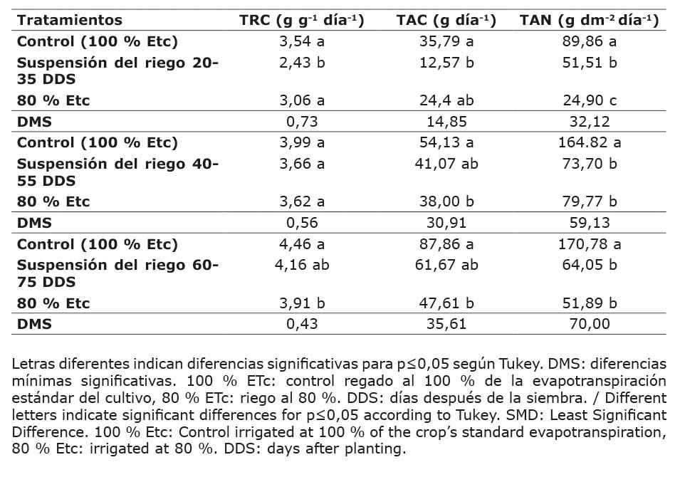 El tratamiento control y el de 80 % Etc no presentaron diferencias significativas (p>0,05) en la TRC y TAC en el período de pre-floración. En esta misma etapa de evaluación la TAN presentó diferencias entre los tratamientos evaluados, fue mayor en el control (89,96 g cm-1 día-1) y menor en el tratamiento con reducción del 80 % del riego 24,90 g cm-1 día-1. En la segunda etapa la TRC no presentó diferencias significativas (p>0,05) entre los tratamientos evaluados, mientras que la TAC y la TAN fueron mayores en el control. Los tratamientos con suspensión y reducción del riego no difirieron estadísticamente entre ellos.