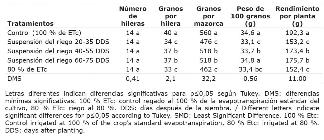 Los tratamientos evaluados no presentaron diferencias estadísticamente significativas (p>0,05) en la variable número de hileras, mientras que las variables número de granos por hilera, número de granos por mazorca, peso de cien granos y el rendimiento por planta difirieron significativamente (p<0,05) entre los tratamientos evaluados. El número de granos por hilera fue mayor en el control 40 granos. Los tratamientos con suspensión del riego en la segunda etapa 37 granos y llenado de grano 37 granos, no presentaron diferencias estadísticamente significativas entre sí. Los tratamientos con suspensión del riego de 20-35 DDS 34 granos y de 80 % ETc 33 granos, presentaron menor número de granos por hilera. El número de granos por mazorca y el número de granos por hilera presentaron el mismo comportamiento en todos los tratamientos estudiados.