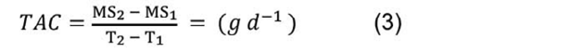 Donde, TRC es la tasa relativa de crecimiento de las plantas, LnMS1 es el logaritmo natural del peso seco aéreo al inicio del período establecido, LnMS2 el logaritmo natural del peso seco aéreo al final del período establecido, T1el tiempo en días al inicio del período establecido, T2 el tiempo en días utilizado al finalizar el período establecido, TAC la tasa absoluta de crecimiento, MS1 el peso seco aéreo al inicio del período establecido, MS2 el peso seco aéreo al final del período establecido, TAN la tasa de asimilación neta, AF1 el área foliar al inicio del período establecido y AF2 el área foliar al finalizar el período establecido.