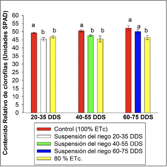 Durante la tercera etapa, el tratamiento con suspensión del riego no mostró diferencias significativas (p<0,05) respecto al tratamiento con reducción del riego en términos de contenido de clorofilas, con valores de 50 y 46 unidades SPAD, respectivamente.