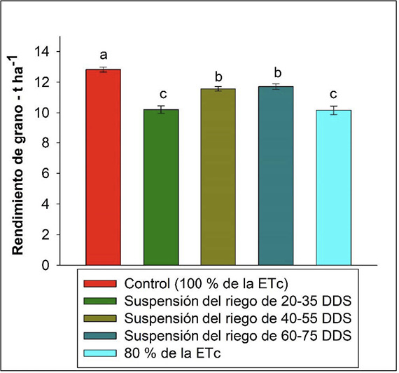 El control presentó un rendimiento estimado de 12,83 t ha-1 y superó a los demás tratamientos evaluados, difirió significativamente (p<0,05) de los tratamientos restantes. Le siguen los de suspensión de riego desde 40-55 y 60-75 DDS con rendimientos de 11,56 y 11,71 t h-1, respectivamente, lo que representó una reducción del 9 y 10 % con relación al tratamiento control. Los tratamientos más afectados por déficit hídrico fueron, el de suspensión del riego de 20-35 y de 80 % ETc, con 10,21 y 10,16 tha-1 respectivamente. Este rendimiento logrado por estos tratamientos eleva la reducción a 21 y 20 % del rendimiento, logrado con el tratamiento sin estrés hídrico en ninguna de las etapas (Figura 3).