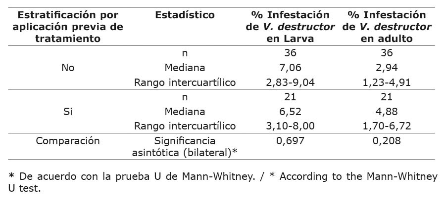 La tasa de infestación de V. destructor en abejas adultas fue mayor del 5 % pero menor del 10 %, esto las clasifica dentro de un rango moderado de infestación pero que requiere de la aplicación de tratamiento para el control de este ácaro (Sanabria et al., 2015). Sin embargo, no se observó diferencia significativa entre las tasas de infestación de V. destructor en adultos y larvas entre colmenas tratadas y no tratadas con Tau-fluvalinato, lo que sugiere una resistencia del ácaro o un inadecuado protocolo de aplicación. El uso de Tau-fluvalinato se consideraba efectivo en tratamiento contra V. destructor, pero el uso indiscriminado en la aplicación de este producto ha generado la aparición de resistencia, incluso se observa resistencia cruzada entre los productos a base de piretroides asociada a una mutación por sustitución de leucina a valina en la posición 925 (L925V) del canal de sodio dependiente (González-Cabrera et al., 2016).