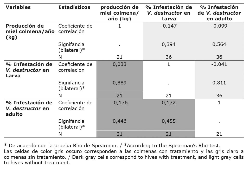 La producción de miel no mostró asociación (p≥0,05) con la tasa de infestación en larvas ni en abejas adultas, independiente de la aplicación previa de tratamiento (Cuadro 2), además, no se observó asociación entre la carga parasitaria de Vairimorpha spp. y la producción de miel (p≥0,05).