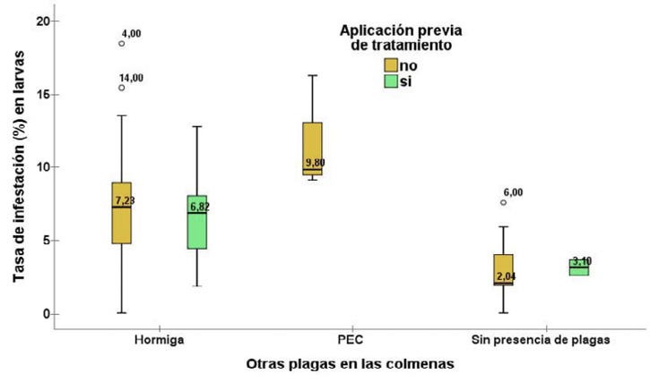 En este estudio, se encontró que en colmenas que no habían recibido tratamiento, la tasa de infestación de V. destructor en larvas fue mayor cuando tenían presencia de PEC en comparación a las que no presentaron plagas (Figura 1), otros estudios han mostrado que infestación por V. destructor puede facilitar la entrada de otros parásitos, como se encontró en un estudio en Madagascar, en el que observó que el PEC sólo estuvo presente en colmenas con V. destructor, porque los ácaros podrían reducir el sistema inmunológico innato de las abejas, lo que hace que las colonias infestadas de ácaros sean más vulnerables a otros patógenos, sin embargo, también es posible que la presencia de PEC facilite la infestación por V. destructor (Rasolofoarivao et al., 2013).