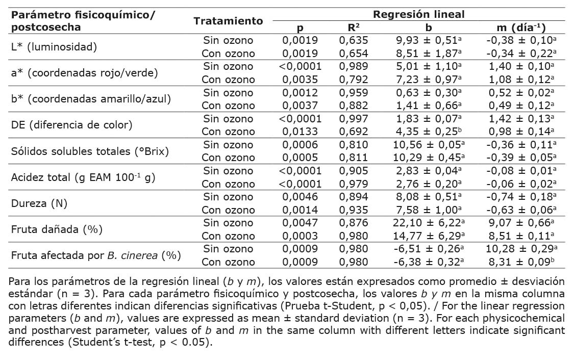 Según el análisis de regresión, todos los modelos fueron significativos, sin importar la aplicación de ozono (p < 0,05), como se observa en el Cuadro 1. Sin, embargo, se encontraron algunas variables que no tuvieron un buen ajuste. Algunos parámetros de color como L*, a* y DE presentaron valores de coeficiente de determinación (R2) menores a 0,80. El resto de los parámetros analizados tuvieron valores de R2 mayores a 0,80 e inclusive por encima del 0,90 (acidez total y fruta dañada por B. cinerea). Lo anterior demuestra el comportamiento lineal de las variables respuesta evaluadas en la mora con respecto al rango de tiempo de almacenamiento testeado.
