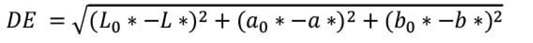 El color fue medido en la parte externa de los frutos con un colorímetro (modelo Color Flex 45/10, Hunter Lab). Para esto, diez unidades de mora se colocaron en la cubeta del equipo de manera que cubrieran la mayor cantidad posible de la placa. Los parámetros de color se expresaron en unidades CIELab (L*, a* y b*) con un ángulo de observador de 10 ° y un iluminante D65. La diferencia de color (DE) se calculó con base en los parámetros L*, a*, y b* para los frutos de mora almacenados a los diferentes tiempos y se tomó como referencia los frutos al inicio del almacenamiento (t= 0 días), según cada tratamiento (con y sin ozono), de acuerdo con la ecuación 1.