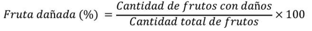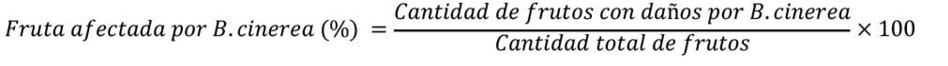 La evaluación de la fruta dañada se llevó a cabo de forma cualitativa, mediante una inspección visual y táctil de todos los frutos de mora en cada caja. Se evaluó la suavidad de los frutos y la presencia de jugo, detectable por manchas en los dedos. En el caso de la fruta afectada por B. cinerea, se realizó una inspección visual de la superficie de todos los frutos en cada caja para identificar síntomas de pudrición y la presencia de micelio en estos. De esta manera, se contabilizaron los frutos afectados. Las ecuaciones 2 y 3 se utilizaron para determinar la cantidad de fruta dañada y la fruta afectada por B. cinerea, respectivamente.