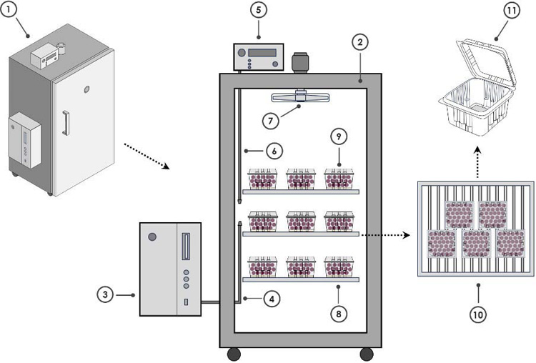 Figure 1. Diagram of the ozone system used for postharvest treatment of fresh blackberries: (1) general view of the equipment; (2) gaseous ozone chamber; (3) ozone generator (corona discharge); (4) ozone generator hose; (5) gaseous ozone detector; (6) ozone detector hose; (7) chamber fan; (8) tray for placing blackberry baskets; (9) basket with blackberries; (10) top view of the tray with the distribution of blackberry baskets; (11) Clamshell-type basket with flexible lid and absorbent pad. National Center for Food Science and Technology, Universidad de Costa Rica, San José, Costa Rica. 2016.