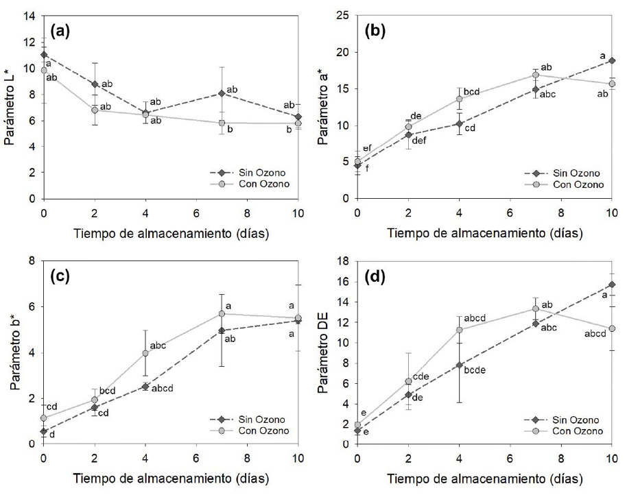 Se observó para los parámetros de color a* (coordenadas de rojo/verde), b* (coordenadas de azul/amarillo) y DE (diferencia de color), que hubo un efecto significativo del tiempo de almacenamiento. Según el ANDEVA, para estos parámetros el valor de p fue menor a 0,001. Los valores promedio de a*, b* y DE aumentaron conforme se acrecentaba el tiempo de almacenamiento, sin importar el tratamiento (Figuras 2b, 2c y 2d). Por otro lado, de acuerdo con el ANDEVA, para todos los parámetros de color evaluados (L*, a*, b* y DE), no se encontró un efecto de la aplicación de ozono ni de la interacción del tiempo de almacenamiento con la aplicación de ozono (todos los valores de p > 0,05).