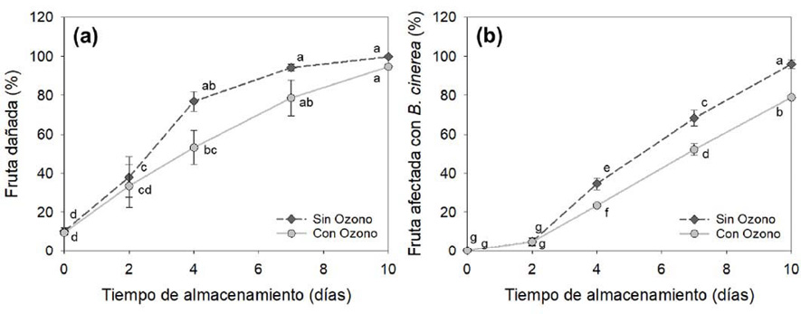 Los resultados obtenidos en este estudio coinciden con otras investigaciones que demuestran la eficacia de la exposición constante al ozono durante el almacenamiento para inhibir el crecimiento de hongos. En el estudio realizado por Cravero et al. (2016), se encontró que el recuento de mohos y levaduras en uvas (Vitis vinífera L. cv. Barbera) fue menor en los frutos tratados con ozono gaseoso (32 µg L-1, 24 h). Otros estudios observaron la reducción de la incidencia de B. cinerea durante el almacenamiento de kiwi (Actinidia deliciosa cv. Hayward) (Luo et al., 2019) y moras andinas (Rubus glaucus Benth) (Horvitz et al., 2021) luego del tratamiento con ozono gaseoso, 79x103 µg L-1 durante 1 h y 700 µg L-1 durante 3 min, respectivamente.