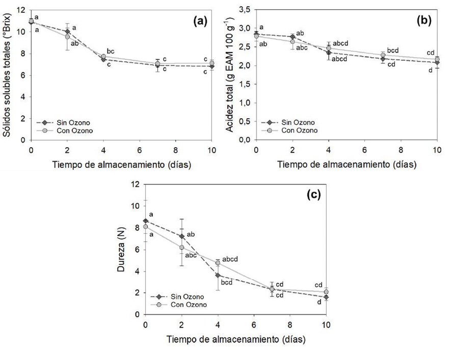 A diferencia de los resultados obtenidos en la presente investigación, se ha observado que la aplicación de ozono puede reducir la acidez total, tal como lo indica el estudio realizado por Lopes Morais et al. (2015) en fresas (Fragaria x ananassa Duch.) almacenadas a 4 °C. Estos autores encontraron que el tratamiento con ozono (1x106 µg h-1, 20 min) generó una reducción de la acidez total con respecto a los frutos no tratados con este gas, en diferentes períodos de almacenamiento (5, 10 y 15 días). También se observó este fenómeno en morera negra (Morus nigra) tratada con ozono a una concentración de 2000 µg L-1 y almacenada a 0 °C hasta 15 días (Han et al., 2017).