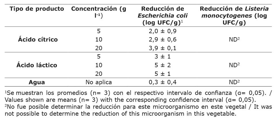 En el caso de la reducción de L. monocytogenes con ácido cítrico, estas son de baja magnitud (1 – 2 log UFC/g) y aumentar la concentración del ácido no ofreció mayores reducciones del microorganismo. Este mismo resultado se observó al desinfectar lechuga con ácido cítrico (10 g l-1 por 5 min) donde las reducciones son cercanas a 1 log UFC/g (Akbas & Ölmez, 2007); sin embargo, en otra investigación sobre lechuga las reducciones aumentan de manera significativa al modificar la concentración del ácido de 5 a 20 g l-1, aunque permanecen en magnitudes similares a las de este estudio (0,51 a 1,64 log UFC/g) (Sagong et al., 2011).