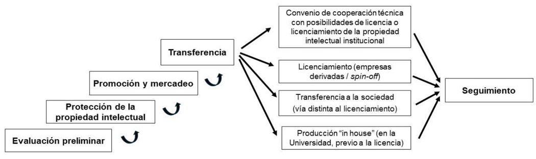 El Centro ha aprovechado un mecanismo de vinculación que tiene la Universidad de Costa Rica y que se gestiona desde la Unidad de Gestión y Transferencia del Conocimiento, Proinnova-UCR, adscrita a la Vicerrectoría de Investigación, para llevar el conocimiento desarrollado desde diferentes proyectos de investigación y cuyos resultados tienen el potencial de ser protegidos bajos figuras de propiedad intelectual a empresas o emprendedores para que puedan innovar en el mercado alimentario. Esta modalidad tiene definidas cinco etapas (Figura 1) que pueden no ser consecutivas y una variedad de vías o estrategias para transferir el conocimiento a la Sociedad. Una vez formalizada la transferencia se establece una etapa de seguimiento para evaluar el impacto.