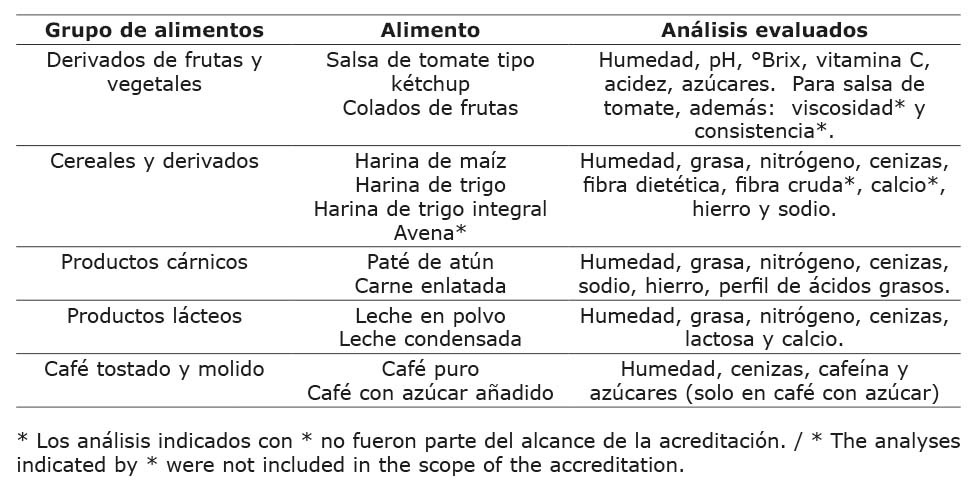 Los tipos de alimentos a analizar se seleccionaban teniendo en cuenta la necesidad de que fueran alimentos homogéneos y estables a temperatura ambiente por al menos tres meses. Se buscaron matrices que cumplieran estas características por cada uno de los siguientes grupos de alimentos: cereales y derivados, lácteos, derivados de frutas y vegetales, producto cárnico y café tostado. El café tostado y molido fue el último tipo de alimento que se incorporó, en respuesta a la necesidad identificada en Costa Rica de asegurar la calidad de los análisis que permiten confirmar la clasificación del café, de acuerdo con parámetros químicos.
