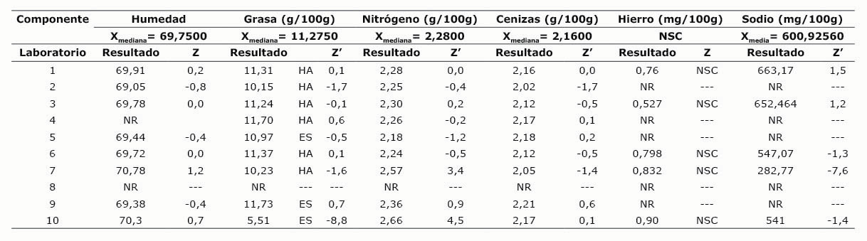 Los análisis por evaluar en cada ronda fueron definidos en función del interés de los laboratorios y considerando que al determinarse el parámetro de desempeño de consenso entre los participantes, era importante conseguir un número de laboratorios mayor a doce. En muchos casos no fue posible lograr esa participación, pero adaptando la metodología de cálculo estadístico, fue posible calcular el parámetro Z(Z’) con confianza (INTECO, 2016). Hubo casos en los que el número de laboratorios reducido sumado a una alta variabilidad entre resultados, no pudo calcularse Z(Z’). Eso hizo que se decidiera no continuar con la evaluación de los análisis de fibra cruda, sodio y calcio en cereales y calcio en producto cárnico y paté de atún enlatado.