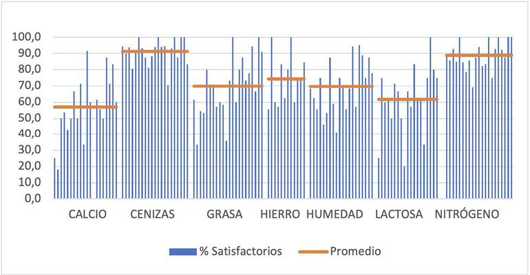 Figura 8. % de resultados satisfactorios en cada una de las rondas regulares de productos lácteos, para los diferentes análisis evaluados (gráfico de barras) y el promedio de los % de resultados satisfactorios para ese ensayo (gráfico de líneas).