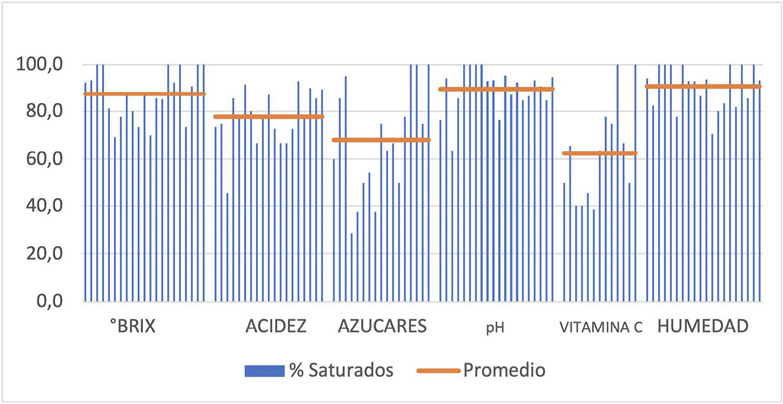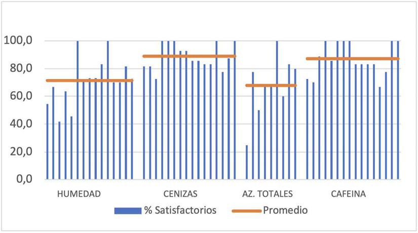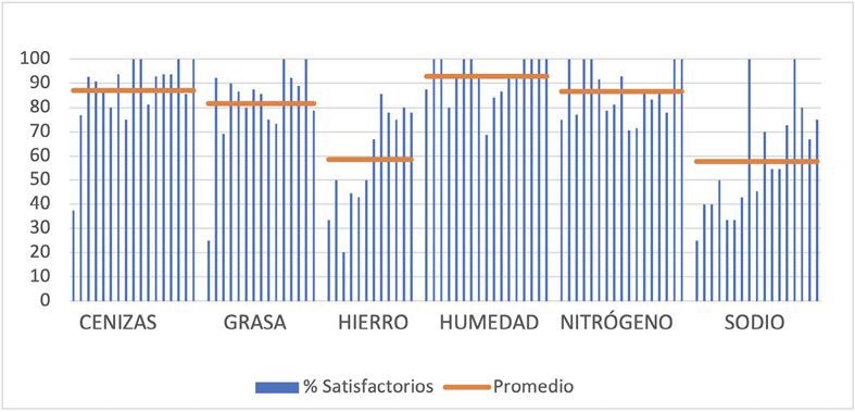 El promedio que se presenta en las Figuras 7 a 11 muestra a grandes rasgos, cuáles son los análisis donde el desempeño fue alto, con más del 85 % de laboratorios con resultados satisfactorios. Son ejemplos de ensayos con buen desempeño: cenizas en cereales (Figura 7), productos lácteos (Figura 8) y productos cárnicos (Figura 9) y humedad en productos cárnicos (Figura 9), derivados de frutas y vegetales (Figura 10) y café tostado y molido (Figura 11), También tuvieron buen desempeño: nitrógeno en cereales (Figura 7), productos lácteos (Figura 8) y cárnicos (Figura 9), y ºBrix y pH en los derivados de frutas y vegetales (Figura 10).
