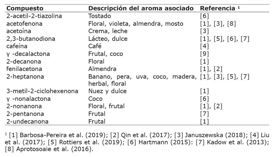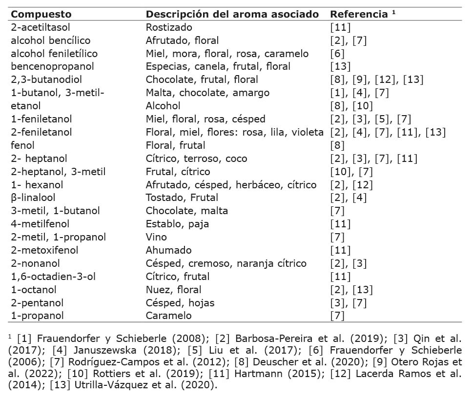 Los alcoholes son compuestos importantes para la generación de los aromas del cacao. Se ha reportado presencia de este tipo de compuestos en el cacao crudo y en muestras analizadas durante las primeras 48 h de la fermentación, es decir, durante la fase anaerobia, cuando las levaduras metabolizan la glucosa. Muchos de los compuestos responsables de aromas deseables (a miel, florales y frutales) de granos de cacao al final de la fermentación, como el 1-feniletanol y el 2,3-butanodiol, pertenecen a esta familia (Cuadro 2). La concentración de alcoholes disminuye durante el secado (Rodríguez-Campos et al., 2012; Rodríguez-Velázquez et al., 2022).
