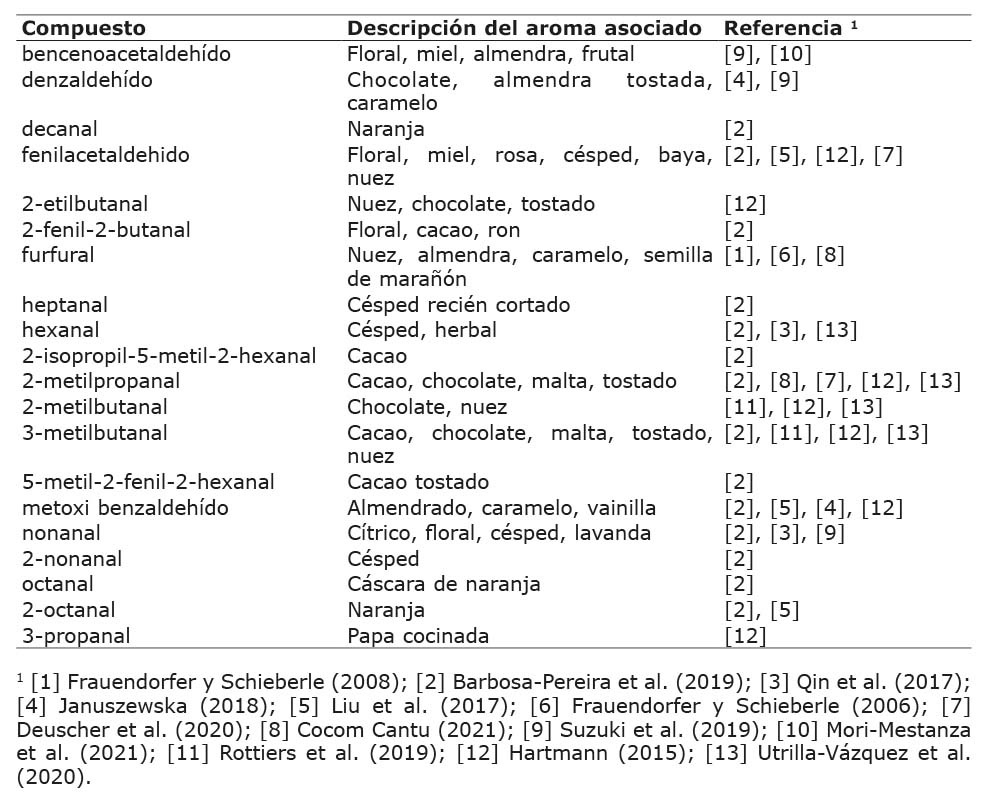 Junto con los alcoholes y cetonas, los aldehídos son compuestos aromáticos asociados en su mayoría con notas deseables en el cacao (Cuadro 3). Algunos de ellos se forman durante las primeras 24 - 48 h de la fermentación, por ejemplo, el 2-etilbutanal y el 2-metilpropanal, asociados con aromas a nuez, chocolate, malta y tostado (Barbosa-Pereira et al., 2019; Hartmann, 2015). Se reporta también que, durante la etapa de tostado, debido a la transformación de aminoácidos específicos por medio de la degradación de Strecker, se producen aldehídos con aromas únicos (Vázquez-Ovando, 2016).