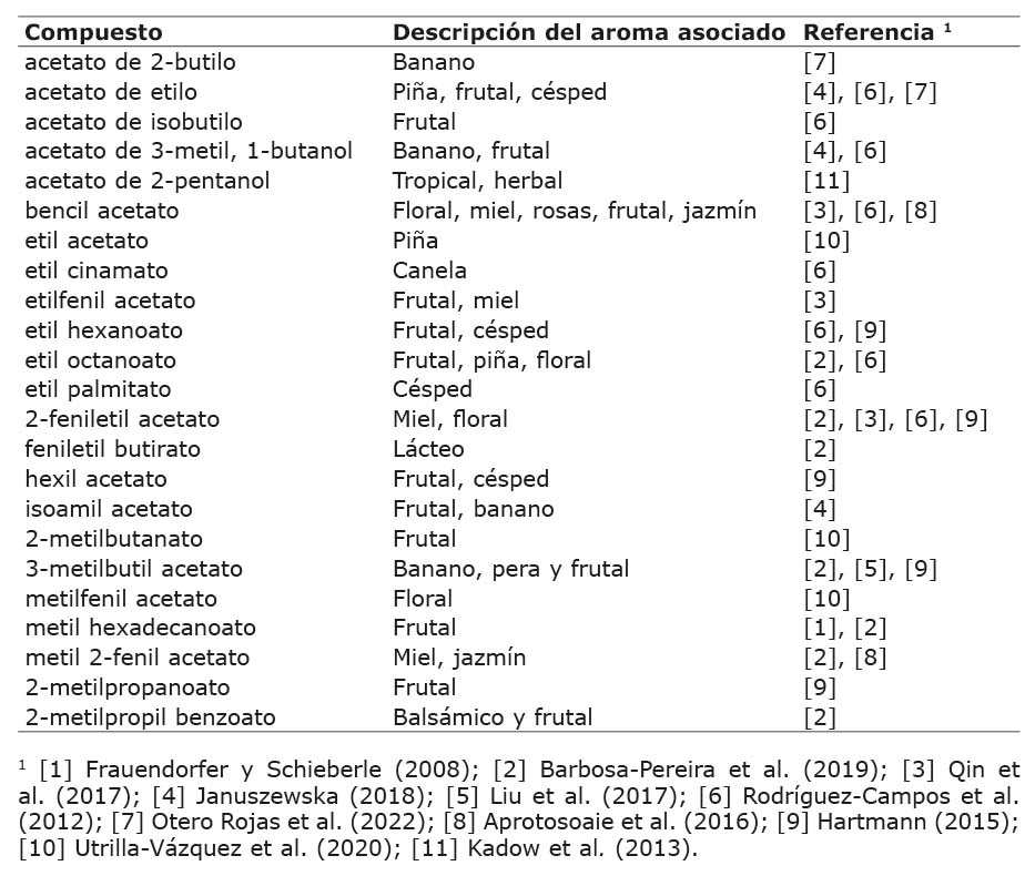 La familia de los ésteres otorga al cacao la mayoría de los aromas diferenciados y están asociados a notas frutales (Rottiers et al., 2019). Se ha reportado que la presencia de este tipo de compuestos aumenta conforme avanza el tiempo de fermentación. Además de que se generan como metabolitos a partir de la fermentación, una de las razones de su incremento es la esterificación de alcoholes por acción de bacterias ácido-acéticas. Algunos ésteres, como el acetato de 2-pentanol, disminuyen en el tiempo y dan lugar a nuevos compuestos aromáticos (Rodríguez-Campos et al., 2012; Rottiers et al., 2019). A continuación, en el Cuadro 5 se describen los ésteres identificados en muestras de cacao de distintos orígenes y sus aromas característicos asociados.