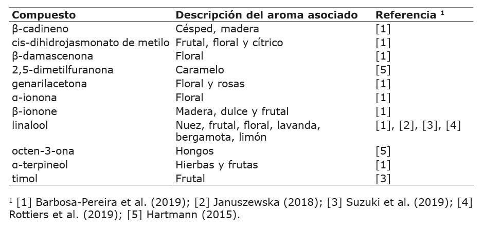 La mayor cantidad de compuestos volátiles asociados con el aroma del cacao se clasifican en ácidos carboxílicos, alcoholes, cetonas, aldehídos y ésteres; en menor cantidad se encuentran pirazinas, terpenos, aminas, furanos y otros (Frauendorfer & Schieberle, 2008; Meneses Quelal et al., 2023). Diversos estudios señalan que el tiempo de fermentación y el tipo de secado influyen en el desarrollo de los compuestos asociados a la calidad del cacao fino y de aroma, por lo que algunos de ellos se consideran un indicador de su calidad (Kongor et al., 2016; Qin et al., 2017). En esta sección se recopilan los principales compuestos volátiles reportados y los aromas específicos relacionados.