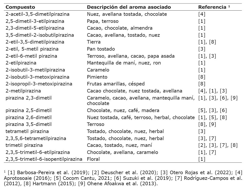 Las pirazinas, que pueden encontrarse en concentraciones muy bajas, son el grupo de compuestos volátiles más importante en relación con las características diferenciadas del aroma del cacao fino. La formación de pirazinas sucede a partir de precursores formados durante la fermentación (Arvelo et al., 2016; Deus et al., 2021), durante el proceso de tostado, cuando el cacao es sometido a altas temperaturas (Hartmann & Schieberle, 2016; Rottiers et al., 2019). Las pirazinas se asocian con notas aromáticas a nuez, avellanas, caramelo, almendras, maní rostizado, entre otros (Cuadro 7).