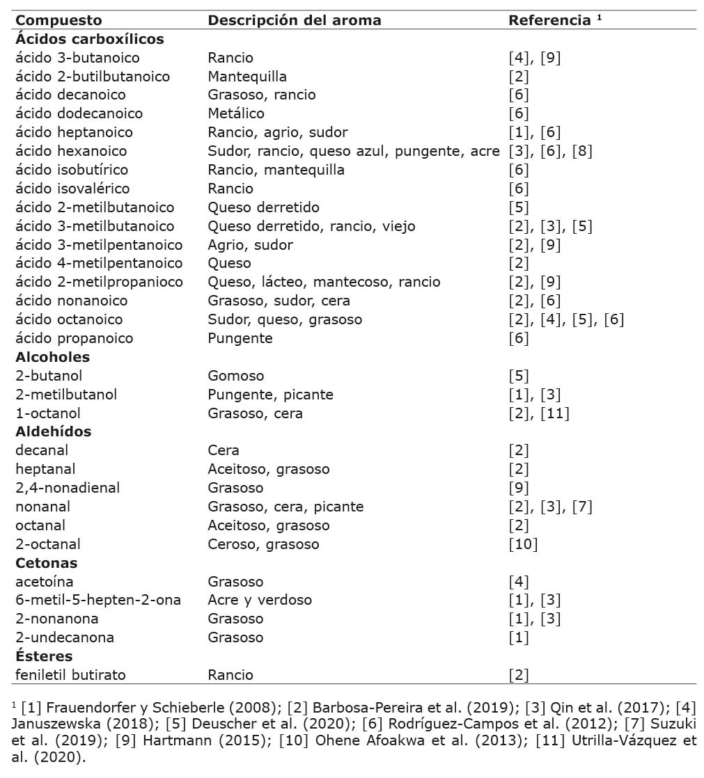 La mayoría de los compuestos asociados con aromas no deseados pertenecen a la familia de los ácidos carboxílicos. Sin importar la familia química a la que pertenezcan, en general los compuestos volátiles no deseados aportan al cacao notas grasosas, rancias, agrias, metálicas y similares al queso, entre otras. Una recopilación de compuestos volátiles generadores de aromas no deseados presentes en diferentes muestras de cacao se presenta en el Cuadro 8. Los compuestos se presentan separados de acuerdo con la familia orgánica a la que pertenecen.