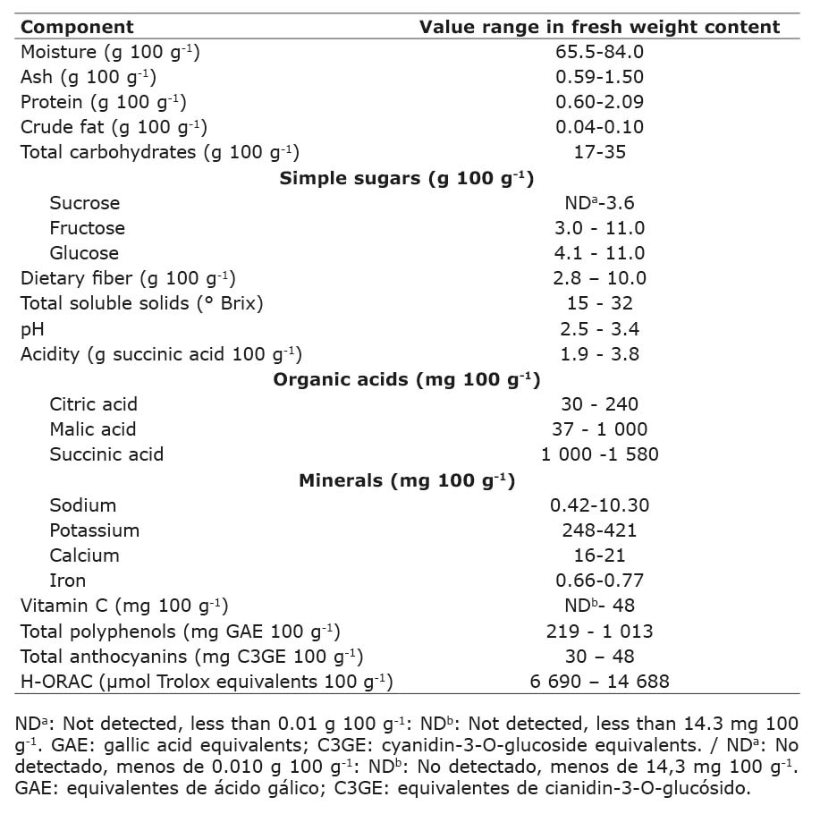 The radical scavenging properties of the huiscoyol fruit evaluated by the H-ORAC method were within the ranges reported by Rojano et al. (2012). The antioxidant capacity was like that of blackberries and higher than that of other Costa Rican tropical fruits evaluated by Montero et al. (2022). This antioxidant property is related to the high content of total polyphenolic compounds and anthocyanins since the edible part of the fruit is relatively low in vitamin C. The antioxidant capacity of the huiscoyol juices produced in this study was higher than that of other commercially available juices derived from red fruits containing anthocyanins, such as blackcurrant, pomegranate, and grape (Matute et al., 2021).