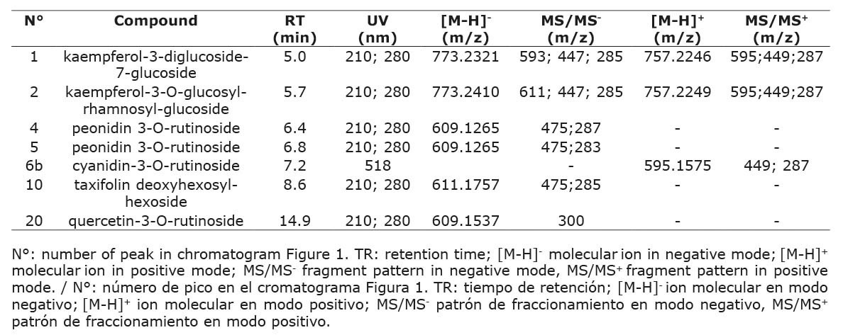Table 2. Tentative identification of flavonols and anthocyanins present in a purified polyphenol extract of the huiscoyol fruit analyzed by UPLC-ESI-Q-TOF/MS. Center for Research in Natural Products, CIPRONA, Universidad de Costa Rica, San José, Costa Rica, 2016.