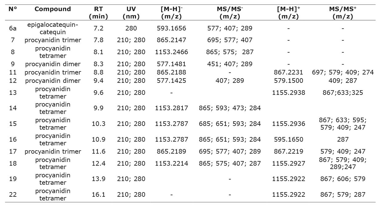 Table 3. Tentative identification of proanthocyanidins present in a purified polyphenol extract of the huiscoyol fruit analyzed by UPLC-ESI-Q-TOF/MS. Center for Research in Natural Products, CIPRONA, Universidad de Costa Rica, San José, Costa Rica, 2016.