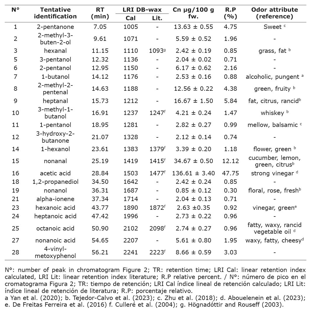 Extracts of aroma compounds were obtained by mixing 40 g of sample, 4 g of sodium chloride, 60 mL of water type I, and 300 mL of 1:1 pentane/ether. The mixture was magnetically stirred for 4 hours. The internal standard was 1-octanol (30 µg). Volatile compounds were separated with a Hewlett-Packard 6890 gas chromatograph coupled to a Hewlett-Packard 5973 quadrupole mass spectrometer with electron ionization mode (EI) generated at 70 eV and a DB-WAX column (J&W Scientific, Folsom, CA, USA), 0.25 µm particle size, 30 mm length, 0.32 mm i.d. The injection volume was 1.0 µL.