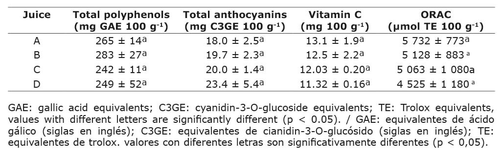 To determine the effects of fruit processing on bioactive compounds and antioxidant capacity, an unrestricted random design was used with four treatments corresponding to each type of juice: pressed juice (A), enzymatic treated juice (B), thermal treated juice (C), enzymatic and thermal treated juice (D). The response variables were total polyphenol content, total anthocyanin content, total vitamin C content and antioxidant activity by the H-ORAC method. For each treatment, the mean and standard deviation were calculated for each variable. Significant differences between means (p ≤ 0.05) were determined by ANOVA. A Tukey test was applied to verify significant differences among means of the response variables in each treatment; differences were indicated with different letters. Statistical analyses were performed using the JMP-SAS version 9 program.
