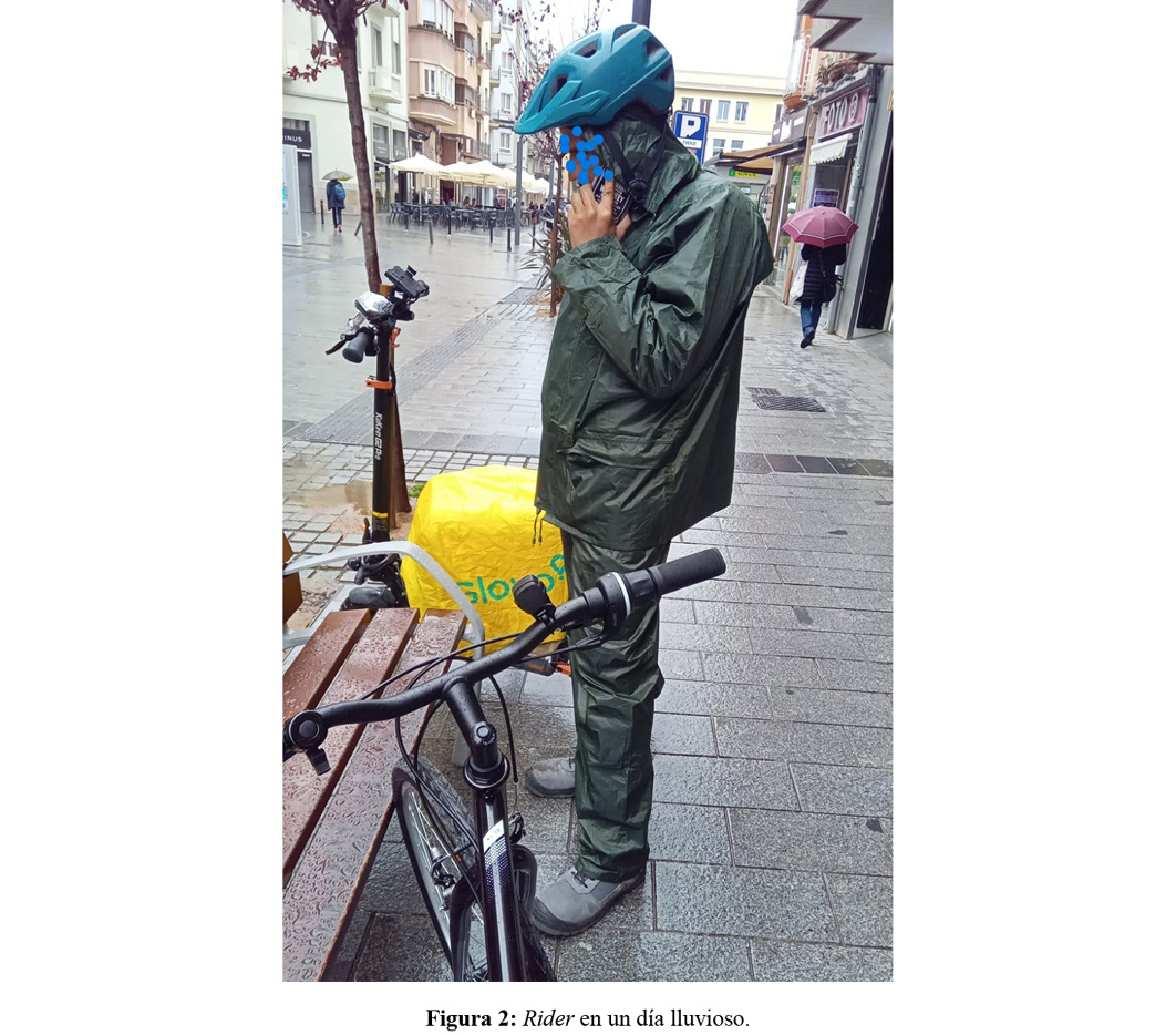 Otro factor que incide decisivamente sobre la utilización de instrumentos de protección por parte de riders es el de las condiciones climáticas. Cuando son adversas, les impulsan a desarrollar diversas prácticas de autocuidado orientadas al uso de instrumentos de protección (Figura 2). En tal sentido, cuando realizan sus repartos en días lluviosos, la autopercepción de los repartidores (tanto quienes utilizan como vehículo de reparto la bicicleta como la moto) cambia radicalmente, a tal punto que al momento de transitar sobre “llantas que se resbalan”, se sienten “inseguros”, más “vulnerables”, saben que otros riders han sufrido caídas en tales circunstancias, lo que los impulsa a considerar a los instrumentos de prevención como imprescindibles. Matías, inmigrante peruano que migro desde “la zona de la sierra peruana”, y que vive en un cuarto alquilado junto a su sobrino, lo expresa muy claramente: