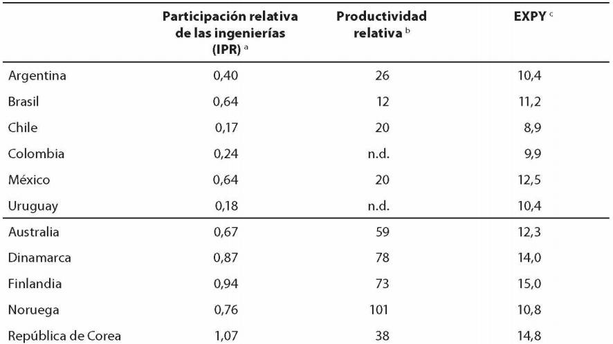 - Participación relativa de las ingenierías (IPR) en el valor agregado manufacturero, productividad relativa y EXPY. Países seleccionados