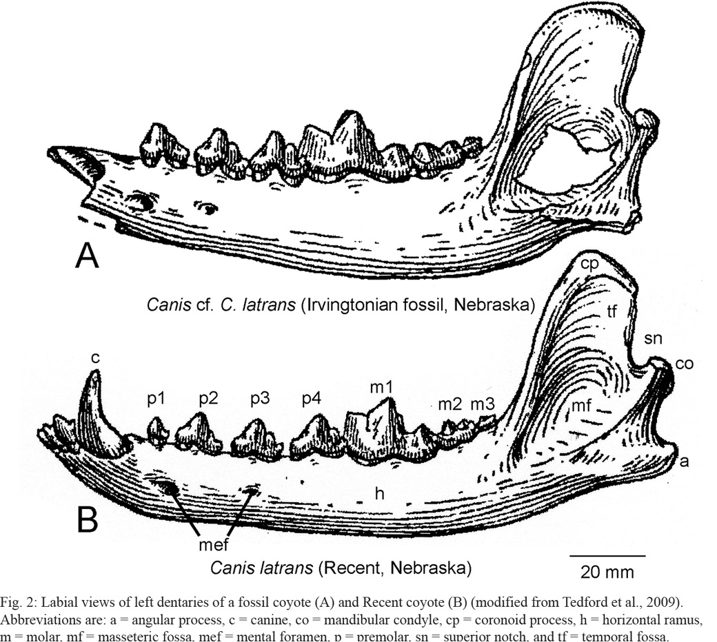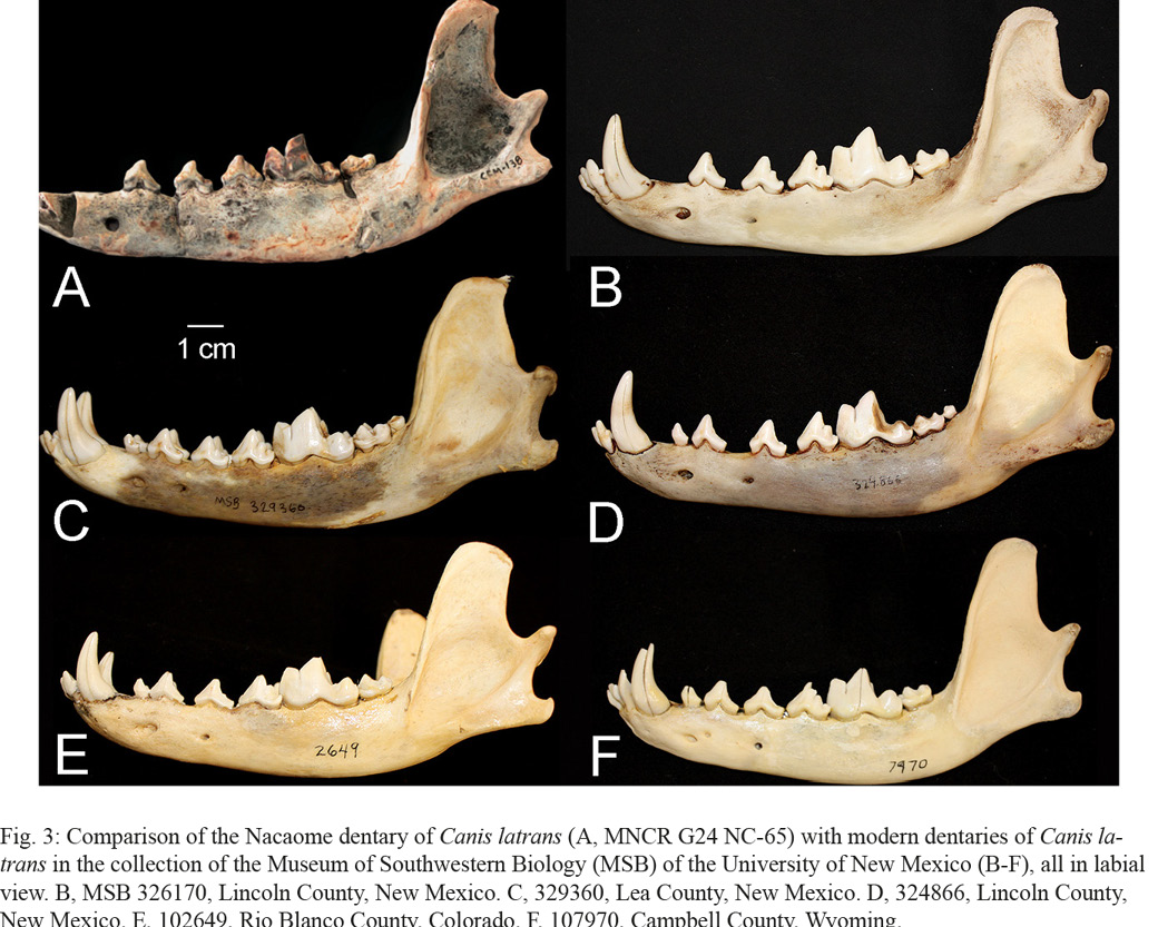 The above description demonstrates that the Nacaome dentary has many features that have long been used by biologists and paleontologists (e. g., Gidley, 1913; Lawrence and Bossert, 1967; Olsen, 1973; Nowak, 1979; Tedford et al., 2009) to distinguish coyotes (Canis latrans) from both domestic dogs (C. familiaris) and wolves (C. lupus):